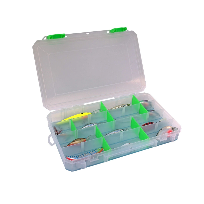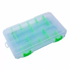 Lurefans largest fishing tackle box with TakLogic Technology and optional permanent dividers creates one, two, three, or four compartments. It features clear plastic, sturdy yet easy-to-open green latches, and comes with Snap-Apart Dividers so you can customize your tackle box the way you want it. The TakLogic Technology is scent-free, environmentally friendly and will protect your lures, baits, weights, hooks and terminal tackle.Dimensions: 14“ x 9“ x 2“ (35.56 x 22.86 x 5.08 cm)Store your Lure Lock box horizontally to utilize the TAK Technology’s full potential. Gravity will activate the TAK’s release time. TakLogic Technology holds and cradles fishing lures, hooks, and terminal fishing tackle in a soft, safe environment, locking it into place while keeping the vibration and movement from dulling the hooks, barbs, paint, and even the overall effectiveness of the lure itself.Our TakLogic Technology is safe and formulated from a soy-based recipe we produce in-house at our Wisconsin factory. It’s made from renewable resources.
