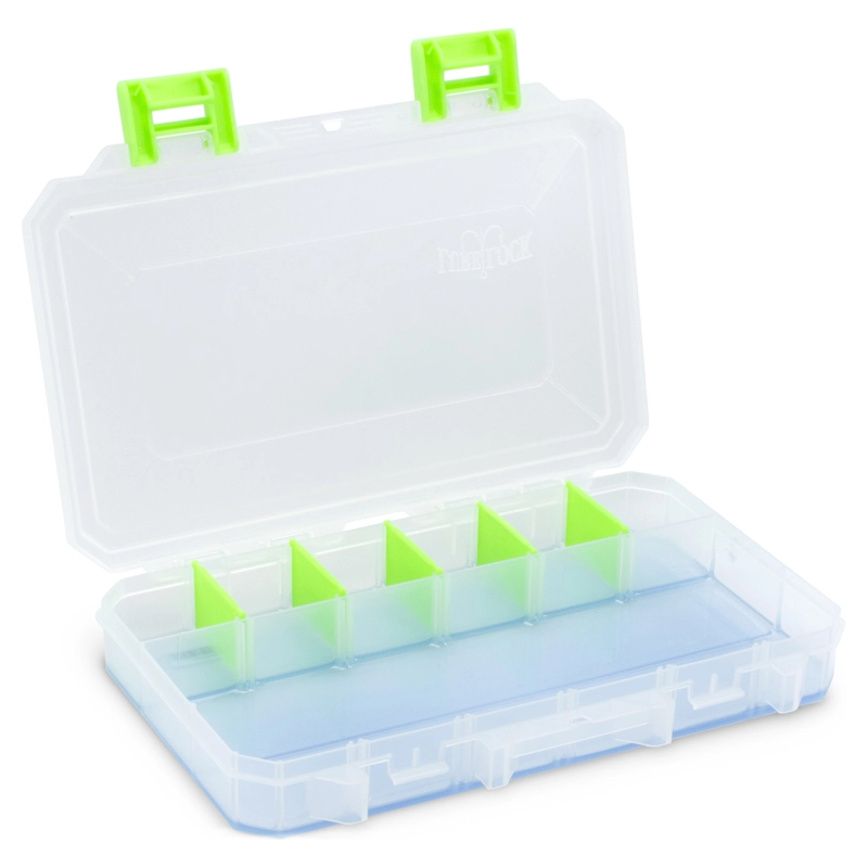 Lurefans medium sized fishing tackle box with TakLogic Technology and optional permanent dividers creates two compartments. It features clear plastic, sturdy yet easy-to-open green latches, and comes with Snap-Apart Dividers so you can customize your tackle box the way you want it. The TakLogic Technology is scent-free, environmentally friendly and will protect your lures, baits, weights, hooks and terminal tackle.Dimensions: 11“ x 7 1/4“ x 1 3/4“ (27.94 x 18.41 x 4.44 cm)Store your Lure Lock box horizontally to utilize the TAK Technology’s full potential. Gravity will activate the TAK’s release time.TakLogic Technology holds and cradles fishing lures, hooks, and terminal fishing tackle in a soft, safe environment, locking it into place while keeping the vibration and movement from dulling the hooks, barbs, paint, and even the overall effectiveness of the lure itself.Our TakLogic Technology is safe and formulated from a soy-based recipe we produce in-house at our Wisconsin factory. It’s made from renewable resources.